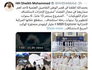 ونشر صاحب السمو الشيخ محمد بن راشد عبر حسابه في تويتر تغريدة قال فيها: “بحمدالله أطلقنا في قصر الوطن التفاصيل العلمية لأحد أهم مشاريعنا في مجال الفضاء “مشروع الإمارات لاستكشاف حزام الكويكبات “ . المشروع يستمر 13 عاماً.. 6 سنوات للتطوير و7 سنوات رحلة استكشاف.. ستقطع خلالها المركبة الاماراتية MBR Explorer ٥ مليار كيلومتر متجاوزة كوكب المريخ لاستشكاف 7 كويكبات والهبوط على آخر كويكب في 2034.. مشروع الإمارات لاستكشاف حزام الكويكبات مشروع علمي وطني ضخم .. ومشروع بحثي ومعرفي عالمي متفرد … سيتضمن انشاء شركات إماراتية خاصة فيتكنولوجيا الفضاء وإنشاء مركز تحكم أرضي لمهمات الفضاء العميق وتدريب كوادر إماراتية جديدة في هذا القطاع .. وستقطع المركبة 10 أضعاف ما قطعه مسبار الأمل .. وشعار شباب الإمارات القائمين على المهمة “لا شيء مستحيل” .. الإمارات تستطيع أن تحلق بعيداً في الفضاء لخمسة مليار كيلومتر لسبب واحد : هو إيمانها بشبابها وتمكينها لأبنائها.. ومن لا يؤمن بقدرات شبابنا الإماراتي الطموح في كافة القطاعات يحتاج لمراجعة نفسه ومراجعة محبته وولائه لوطنه.. “.