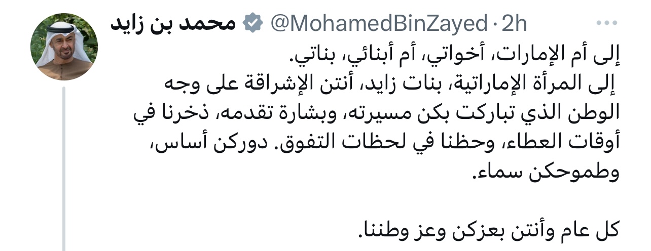 وجاء في تغريدة صاحب السمو الشيخ محمد بن زايد آل نهيان: “إلى أم الإمارات، أخواتي، أم أبنائي، بناتي.                                          إلى المرأة الإماراتية، بنات زايد، أنتن الإشراقة على وجه الوطن الذي تباركت بكن مسيرته، وبشارة تقدمه، ذخرنا في أوقات العطاء، وحظنا في لحظات التفوق. دوركن أساس، وطموحكن سماء.