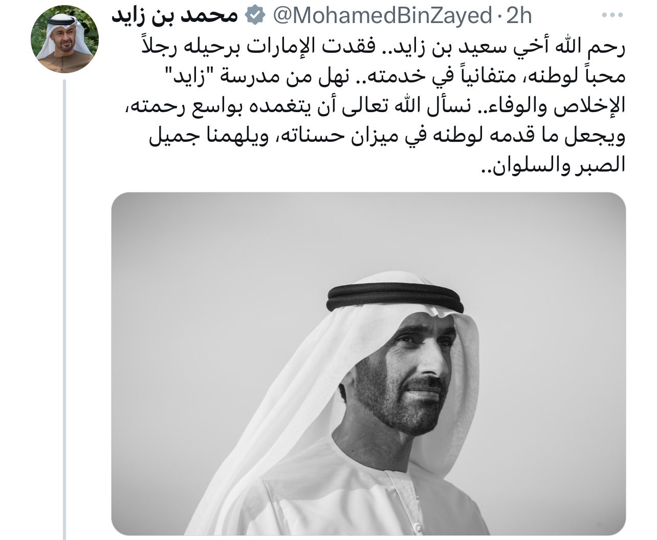 “رحم الله أخي سعيد بن زايد.. فقدت الإمارات برحيله رجلاً محباً لوطنه، متفانياً في خدمته.. نهل من مدرسة “زايد” الإخلاص والوفاء“، بهذه العبارات نعى صاحب السمو الشيخ محمد بن زايد آل نهيان، رئيس دولة الإمارات العربية المتحدة، عبر حسابه الرسمي في تويتر، أخاه المغفور له سمو الشيخ سعيد بن زايد آل نهيان ممثل حاكم إمارة أبوظبي، الذي وافته المنية في الساعات الأولى من اليوم الخميس.