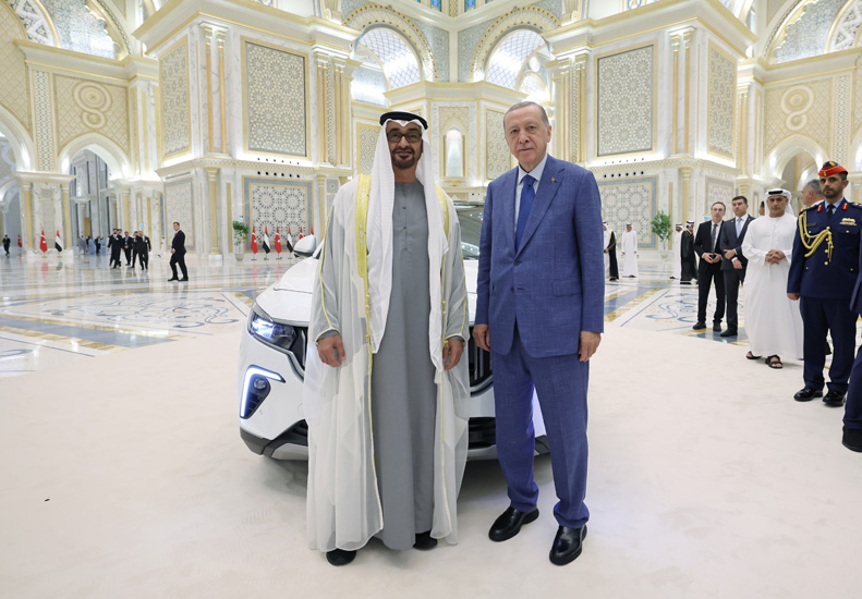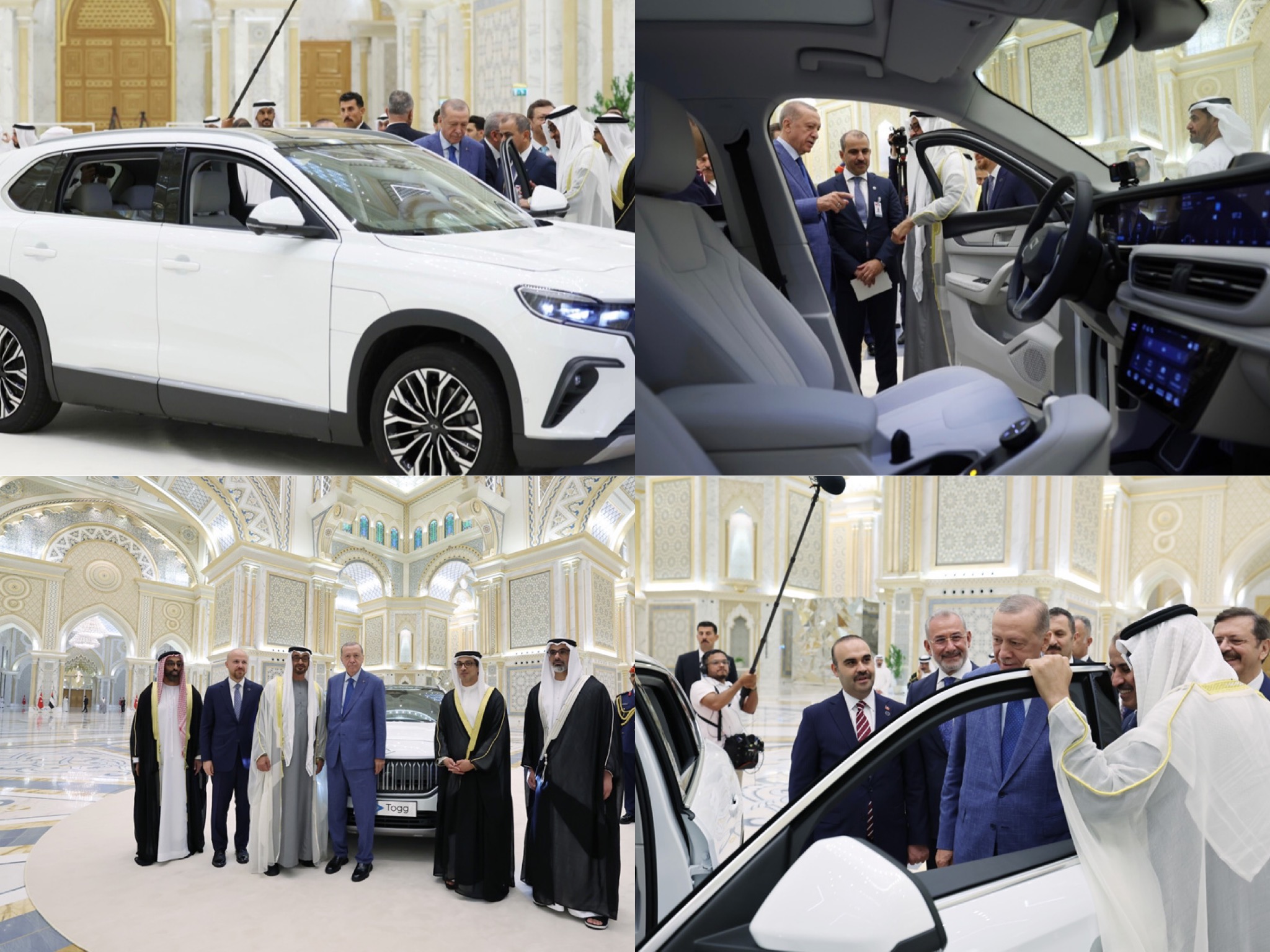 وأهدى الرئيس أردوغان، نظيره الإماراتي الشيخ محمد بن زايد آل نهيان سيارة بيضاء نوع “توغ Togg” من صنع تركي وتحمل اسم “قلعة باموق“. وتفحص الزعيمان السيارة لفترة في باحة القصر ثم التقطا صورة أمامها.
