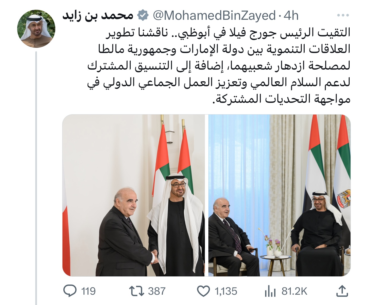 وأعلنت “وكالة الأنباء الإماراتية” عن استقبال صاحب السمو الشيخ محمد بن زايد آل نهيان رئيس دولة الإمارات العربية المتحدة، اليوم فخامة جورج فيلا رئيس جمهورية مالطا الذي يقوم بزيارة رسمية إلى دولة الإمارات.