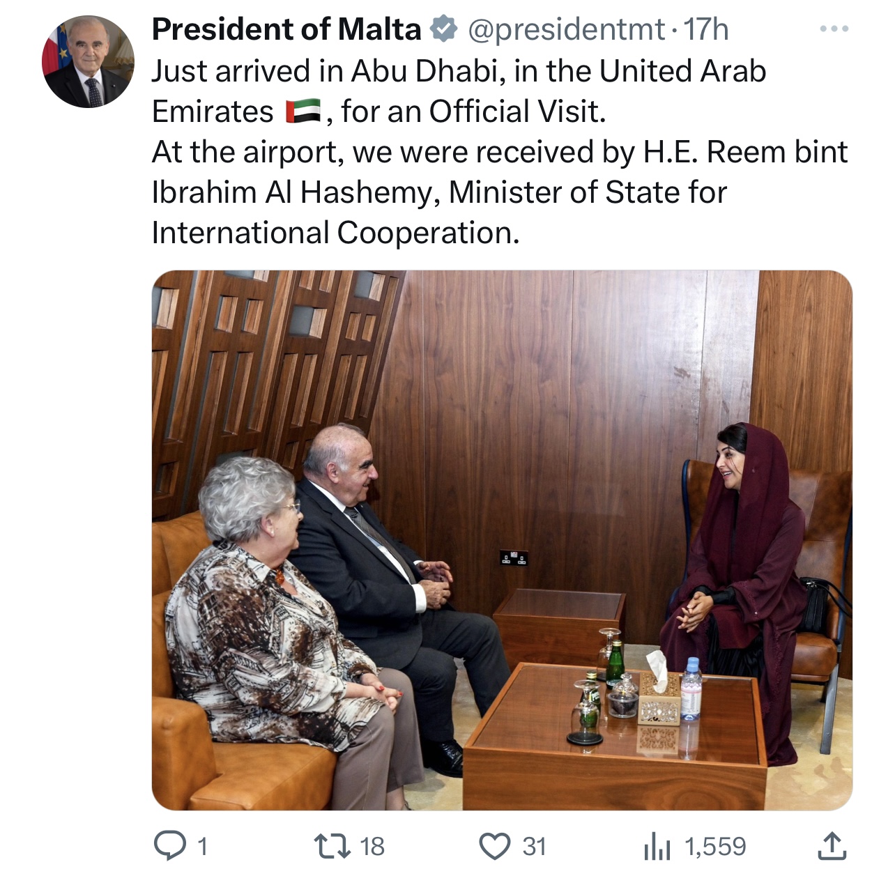من جانبه نشر فخامة جورج فيلا رئيس جمهورية مالطا، في وقتٍ مُتأخر مساء أمس عبر حسابه تويتر، صورةً توثق استقبال معالي ريم بنت إبراهيم الهاشمي“وزيرة دولة الإمارات العربية المتحدة لشؤون التعاون الدولي“، لفخامته رفقة عقيلته في مطار أبوظبي. وجاء في تغريدة رئيس جمهورية مالطا: “وصلت للتو إلى أبوظبي، في الإمارات العربية المتحدة، من أجل زيارة رسمية…في المطار، استقبلتنا معالى ريم بنت ابراهيم الهاشمي وزيرة دولة لشؤون التعاون الدولي“.