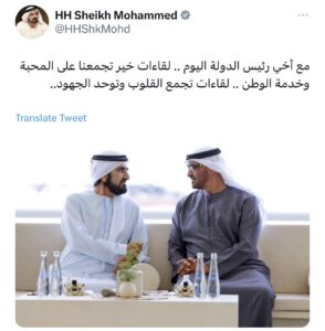 وغرّد صاحب السمو الشيخ محمد بن راشد آل مكتوم قائلاً: “مع أخي رئيس الدولة اليوم .. لقاءات خير تجمعنا على المحبة وخدمة الوطن .. لقاءات تجمع القلوب وتوحد الجهود.. “.