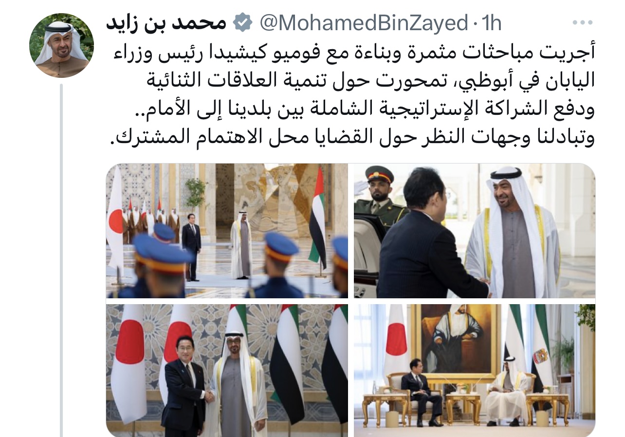 ونشر صاحب السمو رئيس دولة الإمارات العربية عبر حسابه في تويتر، تغريدة جاء فيها: أجريت مباحثات مثمرة وبناءة مع فوميو كيشيدا رئيس وزراء اليابان في أبوظبي، تمحورت حول تنمية العلاقات الثنائية ودفع الشراكة الإستراتيجية الشاملة بين بلدينا إلى الأمام.. وتبادلنا وجهات النظر حول القضايا محلالاهتمام المشترك“.