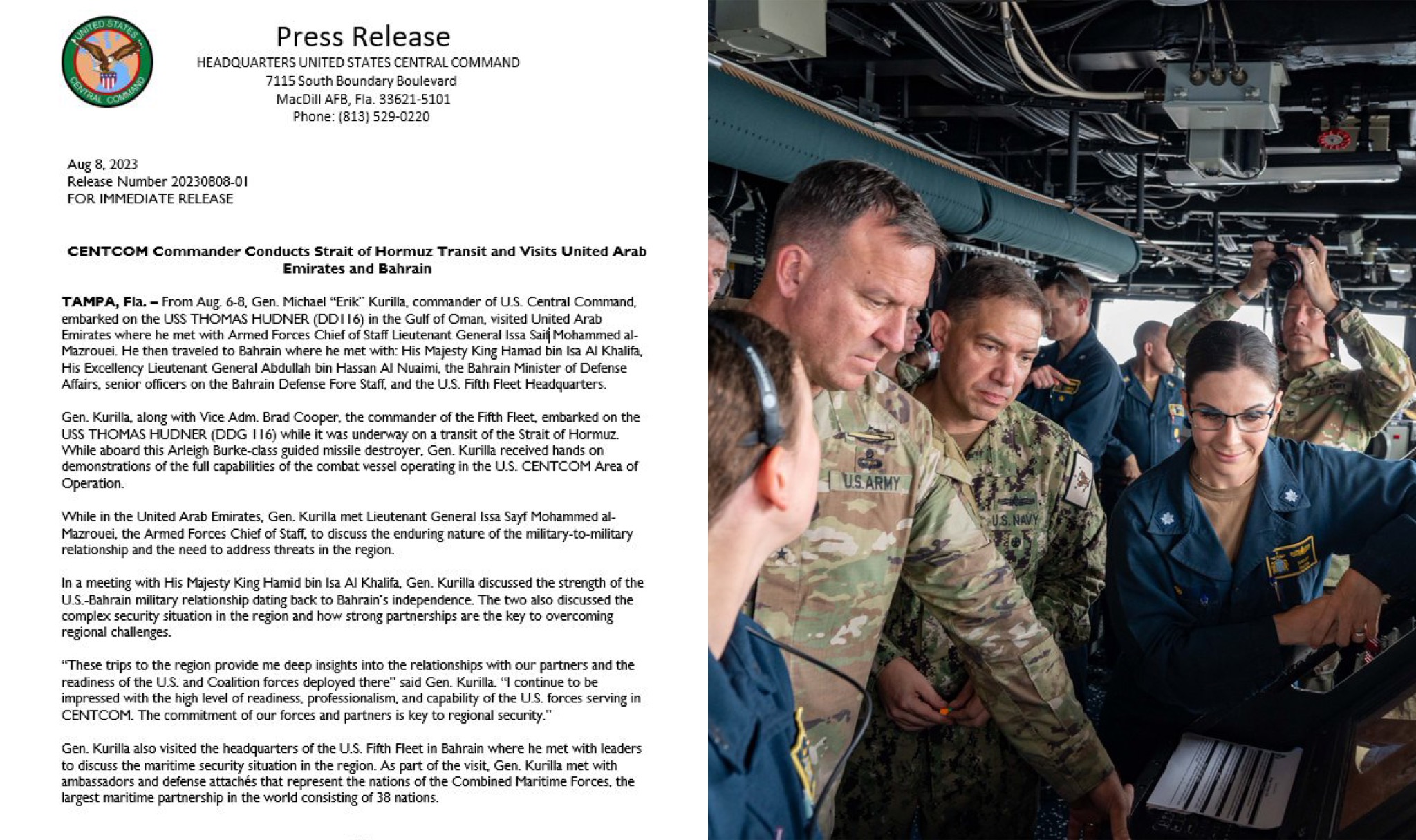 وكانت قد أعلنت القيادة المركزية الأمريكية “CENTCOM” في وقتٍ سابق، من خلال بيانٍ  حصلتنُص خبرعلى نسخةٍ منه، عن زيارة القائد الأعلى للجيش الأمريكي للشرق الأوسط نهاية الأسبوع الماضي. حيث التقى رئيس القيادة المركزية الأمريكية، الجنرال إريك كوريلا ، بالفريق عيسى سيف محمد المزروعي، رئيس أركانالقوات المسلحة الإماراتية، في الإمارات العربية المتحدة لمناقشة الطبيعة الدائمة للعلاقات بين الجيشين والحاجة إلى معالجة التهديدات التي تواجه المنطقة“.