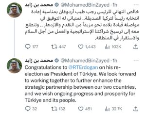 وعبر سموه عبر حسابه في تويتر عن خالصه تهانيه بمناسبة إعادة انتخاب طيب أردوغان رئيساً لتركيا، متمنياً له التوفيق. وقال الشيخ محمد بن زايد عبر تغريدته: “خالص التهاني للرئيس رجب طيب أردوغان بمناسبة إعادة انتخابه رئيساً لتركيا الصديقة.. تمنياتي له التوفيق في مواصلة قيادة بلاده نحو مزيدٍ من التقدم والازدهار .. ونتطلع معه إلى ترسيخ شراكتنا الإستراتيجية والعمل من أجل السلام والاستقرار في المنطقة“.