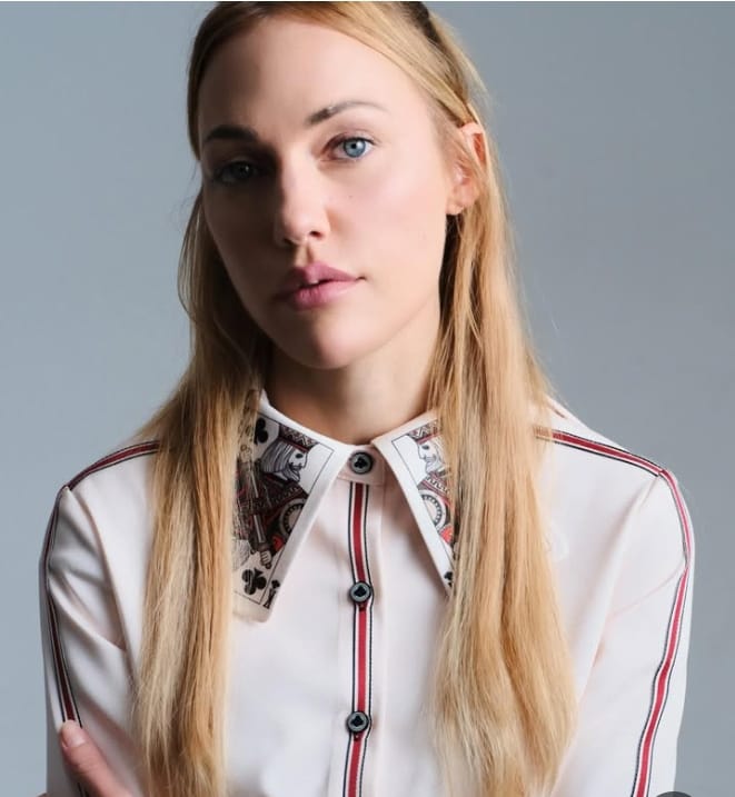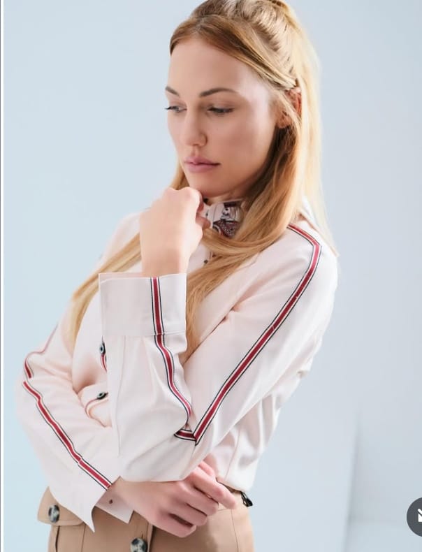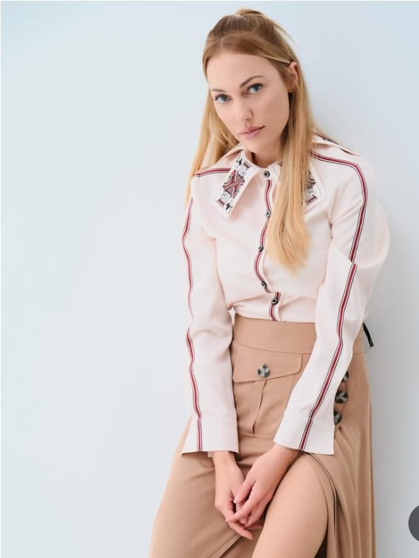 ارتدت أوزرلي تنورة واسعة باللون البيج مع فتحة طويلة على الساق وقميص أبيض مخطط بقلم رفيع باللون الأحمر على الاكمام والعنق. إطلالة ملفتة تظهر نحافة النجمة بهندام عملي رقيق فيه ملامح أنثوية عملية أضافت عليه صخب رائع مع حذاء باللون الأحمر.