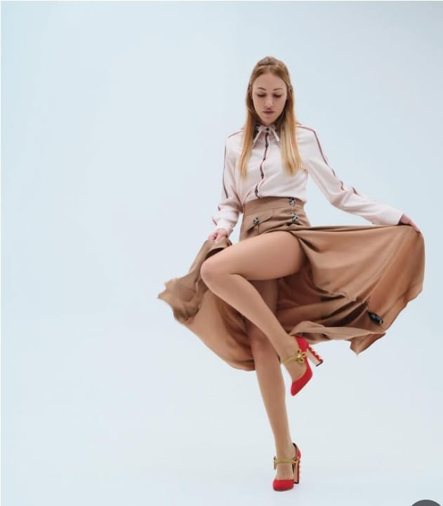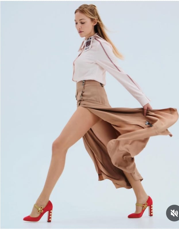 ارتدت أوزرلي تنورة واسعة باللون البيج مع فتحة طويلة على الساق وقميص أبيض مخطط بقلم رفيع باللون الأحمر على الاكمام والعنق. إطلالة ملفتة تظهر نحافة النجمة بهندام عملي رقيق فيه ملامح أنثوية عملية أضافت عليه صخب رائع مع حذاء باللون الأحمر.