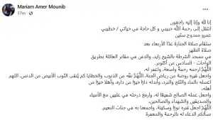 عبّرت الفنانة مريم عامر منيب عن حزنها العميق بعد وفاة خطيبها الفنان الشاب عمرو ممدوح ستين. حيث كتبت عبر حسابها الشخصي على موقع “فيسبوك”: إنا لله وإنا إليه راجعون، انتقل إلى رحمة الله حبيبي وكل شيء في حياتي/ خطيبي عمرو ممدوح ستين.