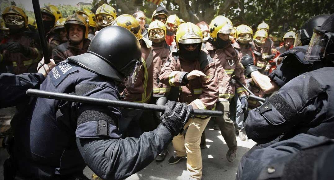 ومنذ عدة أشهر، دخل رجال الإطفاء الإسبان بإضراب للمطالبة بظروف عمل أفضل و”إطار قانوني وطني” لتنظيم وظائفهم بشكل أفضل، وجعل الظروف أكثر أمانًا ومساواة. لكن التوترات تصاعدت عندما قامت شرطة مكافحة الشغب المسلحة بالهراوات بصد 200 من رجال الإطفاء المحتجين، الذين جاؤوا مسلحين بقاذف لهب، أو على الأقل جهاز يشبه قاذف اللهب ينفث النار.