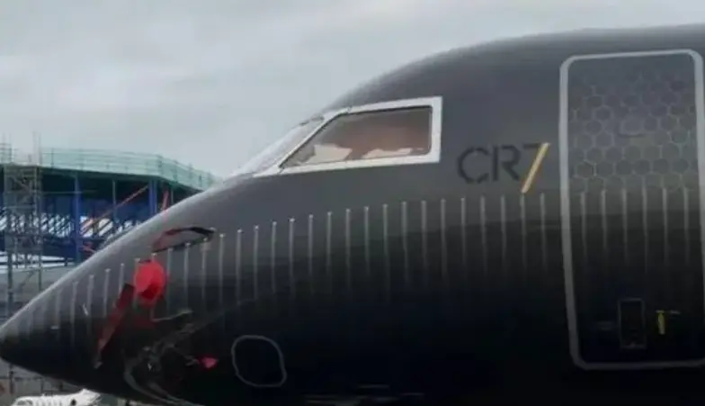 وطائرة اللاعب الأشهر بالعالم تتزين بالعلامة التجارية للدون “CR7” وكلمة “Suiii” الخاصة باحتفاله الشهير عند تسجيل الأهداف.