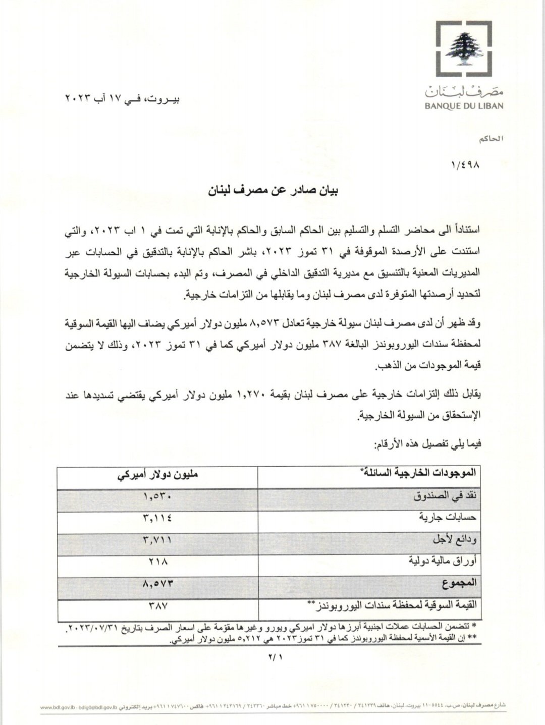 وفي تعميم للمركزي، كشف أنّه لدى مصرف لبنان سيولة خارجية تعادل 8,573 مليون دولار أميركي، يُضاف إليها القيمة السوقية لمحفظة سندات اليوروبوندز البالغة 387 مليون دولار أميركي كما في 31 تموز 2023، وذلك لا يتضمن قيمة الموجودات من الذهب.