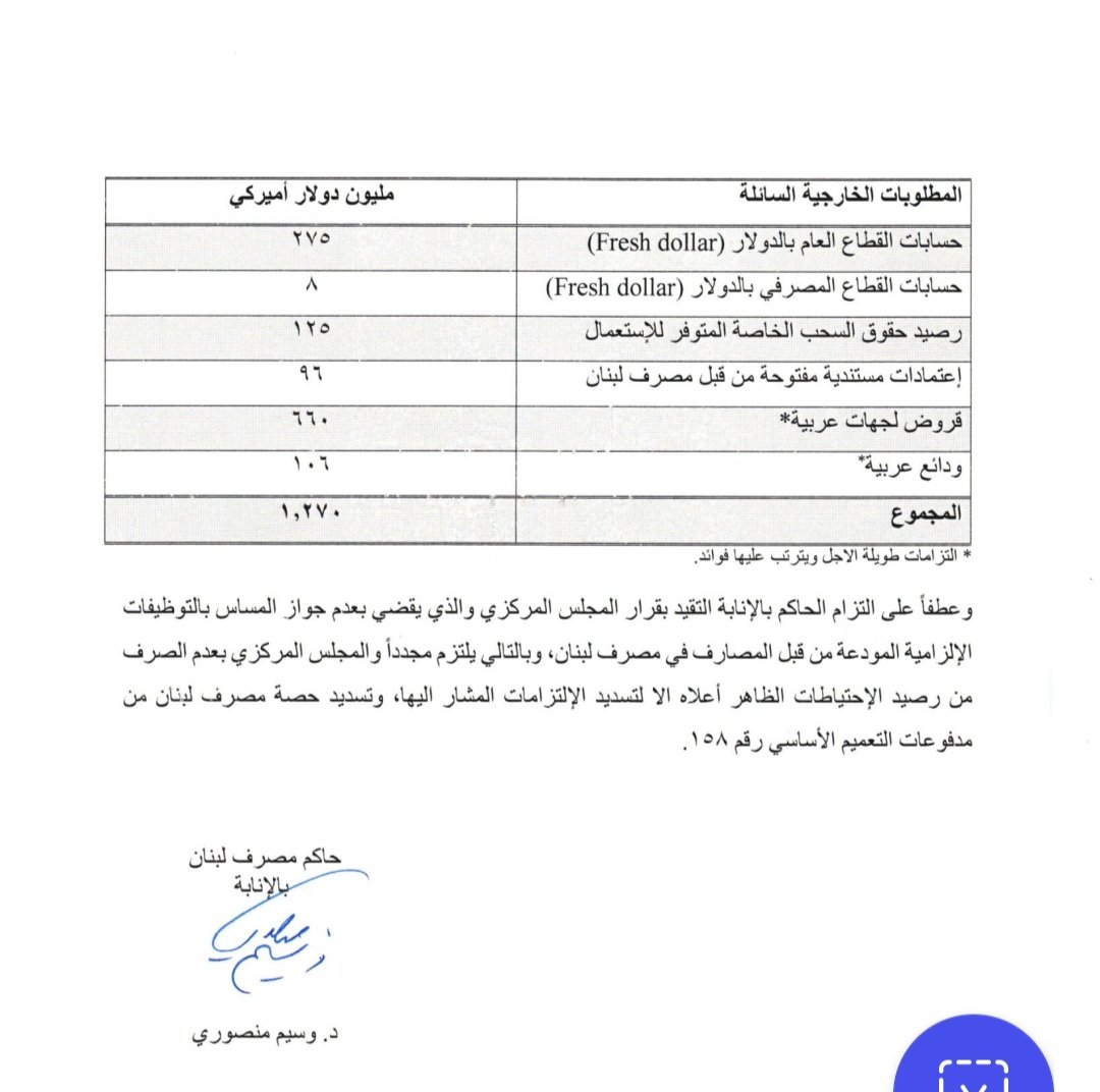 ويقابل ذلك إلتزامات خارجية على مصرف لبنان بقيمة 1,270 مليون دولار أميركي يقتضي تسديدها عند الاستحقاق من السيولة الخارجية.