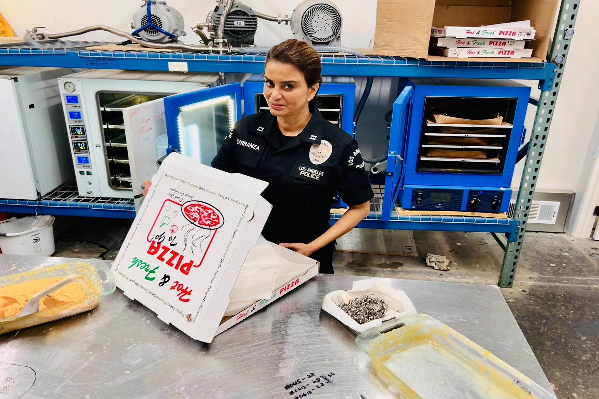 وتُظهر الصور المنشورة على وسائل التواصل الاجتماعي من الشرطة LAPD ما يبدو أنه مطبخ تجاري فعال، ولكن بدلاً من البيتزا ، كانت هناك دفعات من زيت المخدرات التي ترسل في تلك المغلفات، وعلى أرفف التبريد.