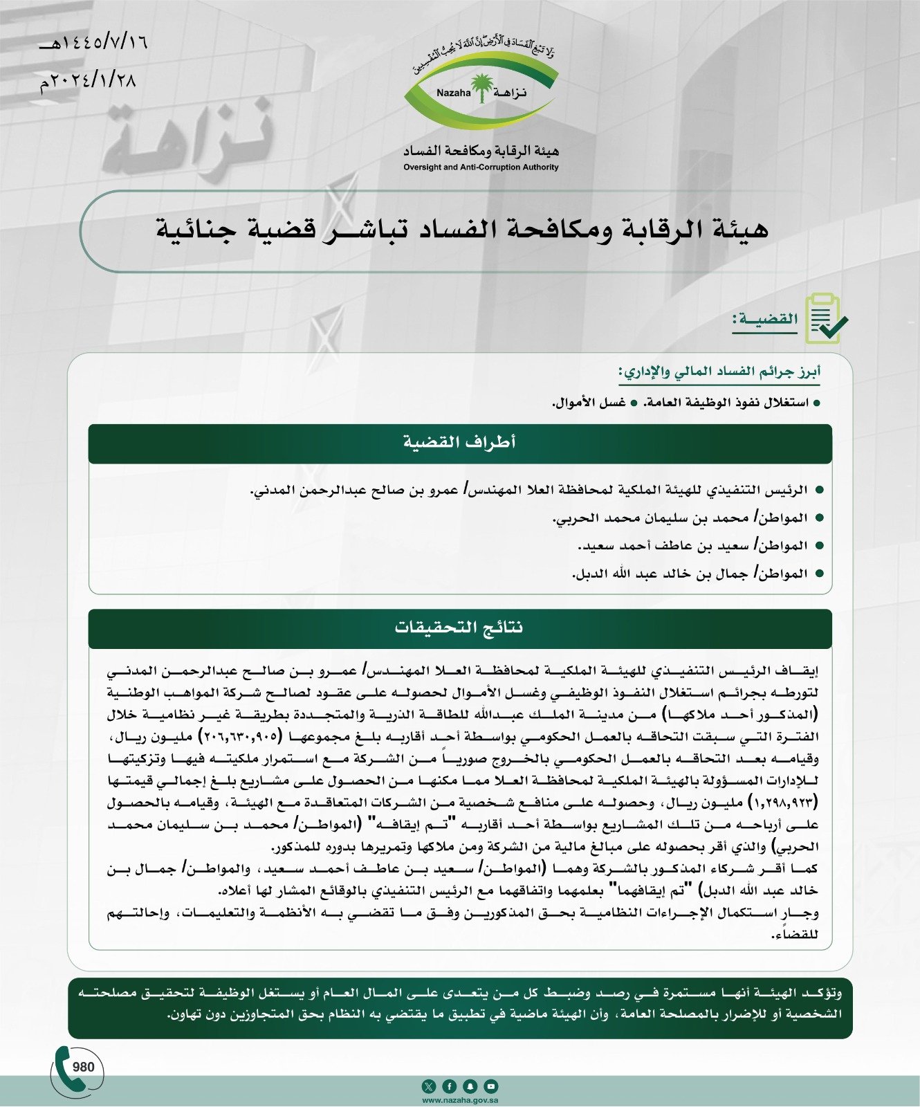 وقال مصدر مسؤول في الهيئة: تم إيقاف المدني لتورطه بجرائم استغلال النفوذ الوظيفي وغسل الأموال، لحصوله على عقود لصالح شركة المواهب الوطنية (المذكور أحد ملاكها) من مدينة الملك عبدالله للطاقة الذرية والمتجددة بطريقة غير نظامية، خلال الفترة التي سبقت التحاقه بالعمل الحكومي بواسطة أحد أقاربه بلغ مجموعها 200 و6 ملايين و630 ألفا و905 ريالات، وقيامه بعد التحاقه بالعمل الحكومي بالخروج صورياً من الشركة مع استمرار ملكيته فيها وتزكيتها للإدارات المسؤولة بالهيئة الملكية لمحافظة العلا مما مكنها من الحصول على مشاريع بلغ إجمالي قيمتها مليونا و298 ألفا و923 ريالاً.