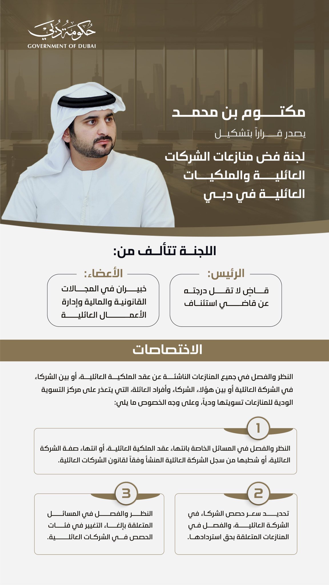 أصدرتُ قراراً بتشكيل لجنة فضّ منازعات الشركات العائلية والملكيات العائلية في إمارة دبي بهدف تحقيق استدامتها والحفاظ على دورها المحوري في اقتصاد دبي.
