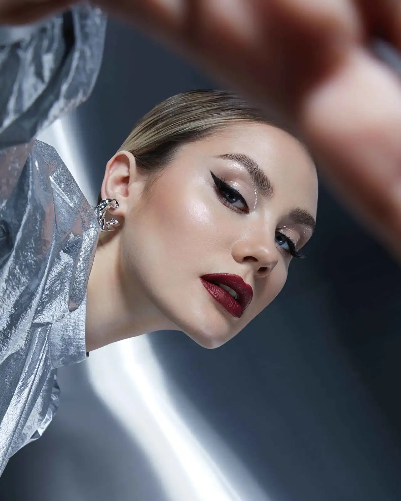يجمع مكياج الميتاليك بين الجرأة والأنوثة من خلال ظلال فضية معدنية على الجفون مع أحمر شفاه بلمسة ذهبية معدنية لإطلالة فاخرة.