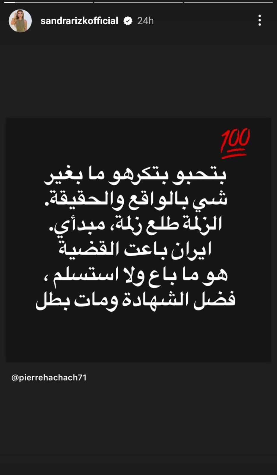ونشرت ساندرا في ستوري أخر: بتحبو أو بتكرهو ما بغير شي بالواقع والحقيقة… إيران باعت القضية وهو ما باع ولا استسلم، فضل الشهادة ومات بطل.