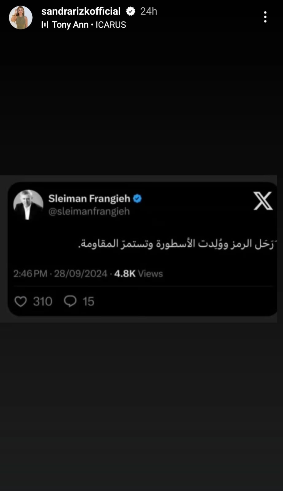 ونشرت ساندرا رزق عبر خاصية الستوري على حسابها في انستغرام تعبيراً عن حزنها مستعينة بالرثاء الذي كتبه الزعيم سليمان فرنجية حليف نصر الله: رحل الرمز وولدت الأسطورة، وتستمر المقاومة.