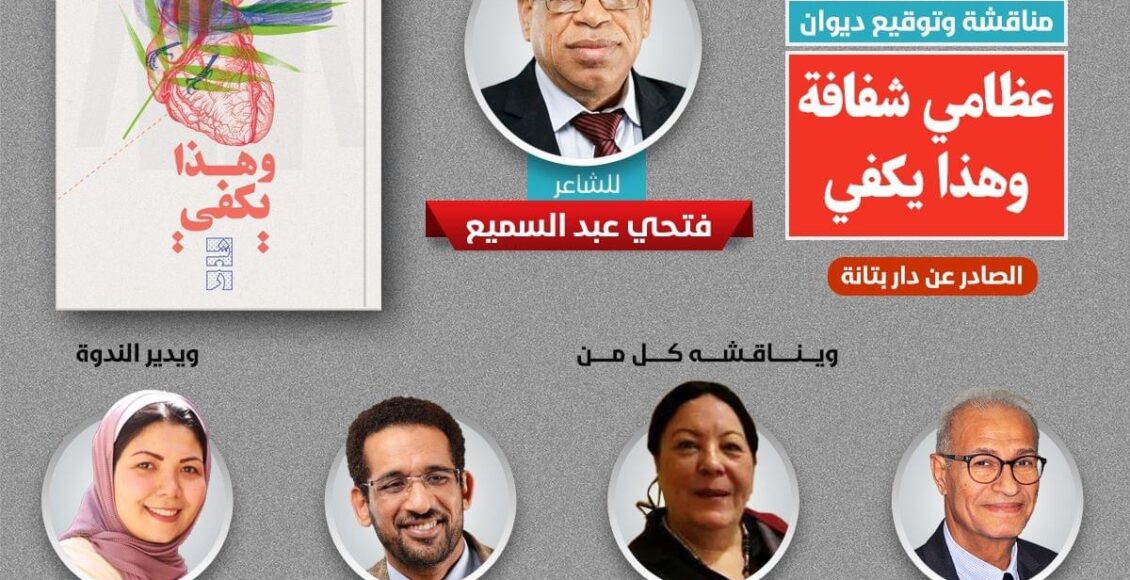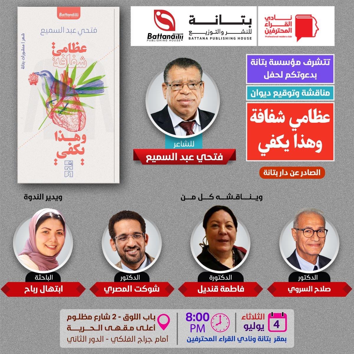 غدًا 4 يوليو 2023 فى تمام السابعة مساء تنظم دار بتانة للنشر والتوزيع فى مقرها بوسط البلد بالقاهرة أمسية لمناقشة ديوان ( عظامي شفافة وهذا يكفي ) للشاعر فتحي عبدالسميع .
