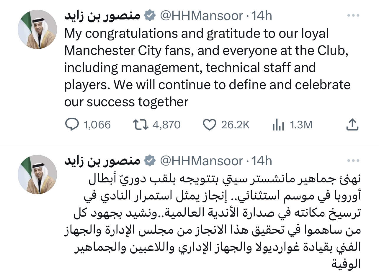 ونشر سموه عبر حسابه في تويتر قال فيها: “نهنئ جماهير مانشستر سيتي بتتويجه بلقب دوري أبطال أوروبا في موسم استثنائي.. إنجاز يمثل استمرار للنادي في ترسيخ مكانته في صدارة الأندية العالمية..ونشيد بجهود كل من ساهموا في تحقيق هذا الانجاز، من مجلس الإدارة، والجهاز الفني بقيادة غوارديولا، والجهاز الإداري، واللاعبين والجماهير الوفية“.