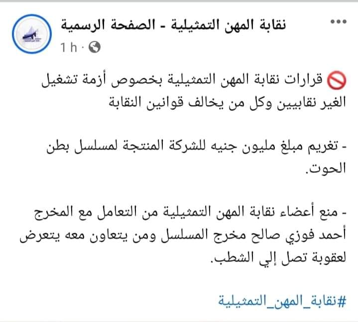 وفي وقت سابق قررت نقابة المهن التمثيلية بقيادة الفنان الدكتور أشرف زكي، تغريم الشركة المنتجة لمسلسل بطن الحوت بطولة الفنان محمد فراج مبلغ 100 ألف جنيه، بسبب ظهور التيك توكر كروان مشاكل في الحلقة الثانية.