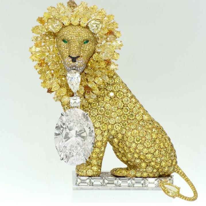 الدبوس عبارة عن أسد جسمه مصنوع من الماس الأصفر الزاهي ، ويتكون الشعر من العديد من الظلال المختلفة من الماس الأصفر لتوفير الملمس والأبعاد. يتدلى من الفم ماسة بيضاء عديمة اللون تزن أكثر من 50 قيراطًا، والعينان مصنوعتان من الزمرد، المعروف بأهميته الروحية وقوته العلاجية وحظه السعيد. بالإضافة إلى ذلك، يقف الأسد على منصة مصنوعة من الماس الأبيض المقطوع على طريقة آشر.