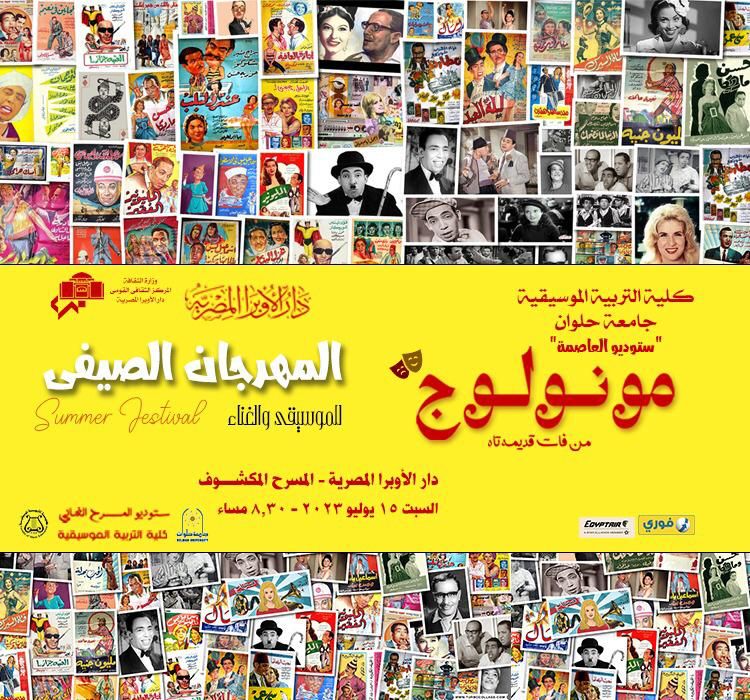 تنطلق فعاليات المهرجان الصيفى الذى تنظمه دار الأوبرا المصرية برئاسة الدكتور خالد داغر بحفل لفريق ستديو العاصمة الذى يضم نخبة من طلاب خريجي كلية التربية الموسيقية بجامعة حلوان المتخصصون في المسرح الغنائي ويحمل عنوان ” المونولوج “من فات قديمه تاه”