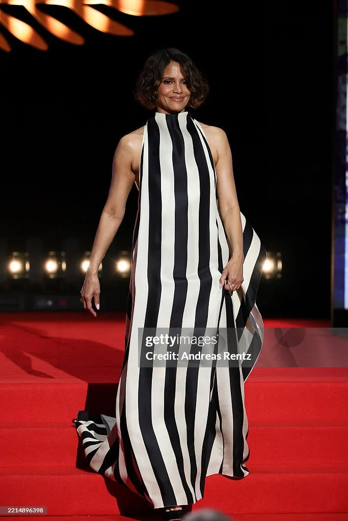 برزت هالي بيري بفستان خرج عن المألوف من حيث القَصّة والنقشة. تصميم مقلّم بالأسود والأبيض، بقَصّة غير متماثلة عند الياقة وانسيابية مقصودة، أظهر كيف يمكن تحوّلاً غير متوقع أن يصبح فرصة للأناقة.