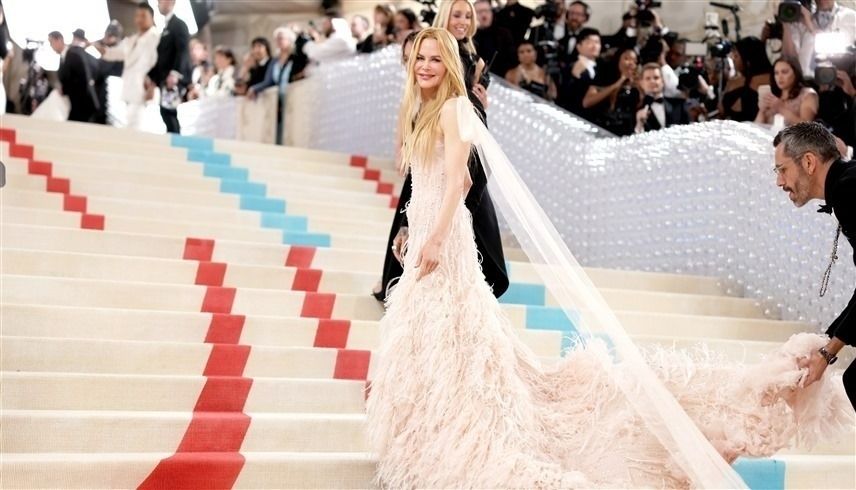 اللون الزهري أيضاً كان خيار نيكول كيدمان التي تألقت بفستان مزين بالريش من شانيل. للفستان قصة أيضاً، فقد تم تصميمه من قبل كارل وارتدته نيكول في العام 2004 خلال الإعلان الذي شاركت فيه عن عطر شانيل NO.5، وبالتالي هي ترتديه بعد عقدين تقريباً.