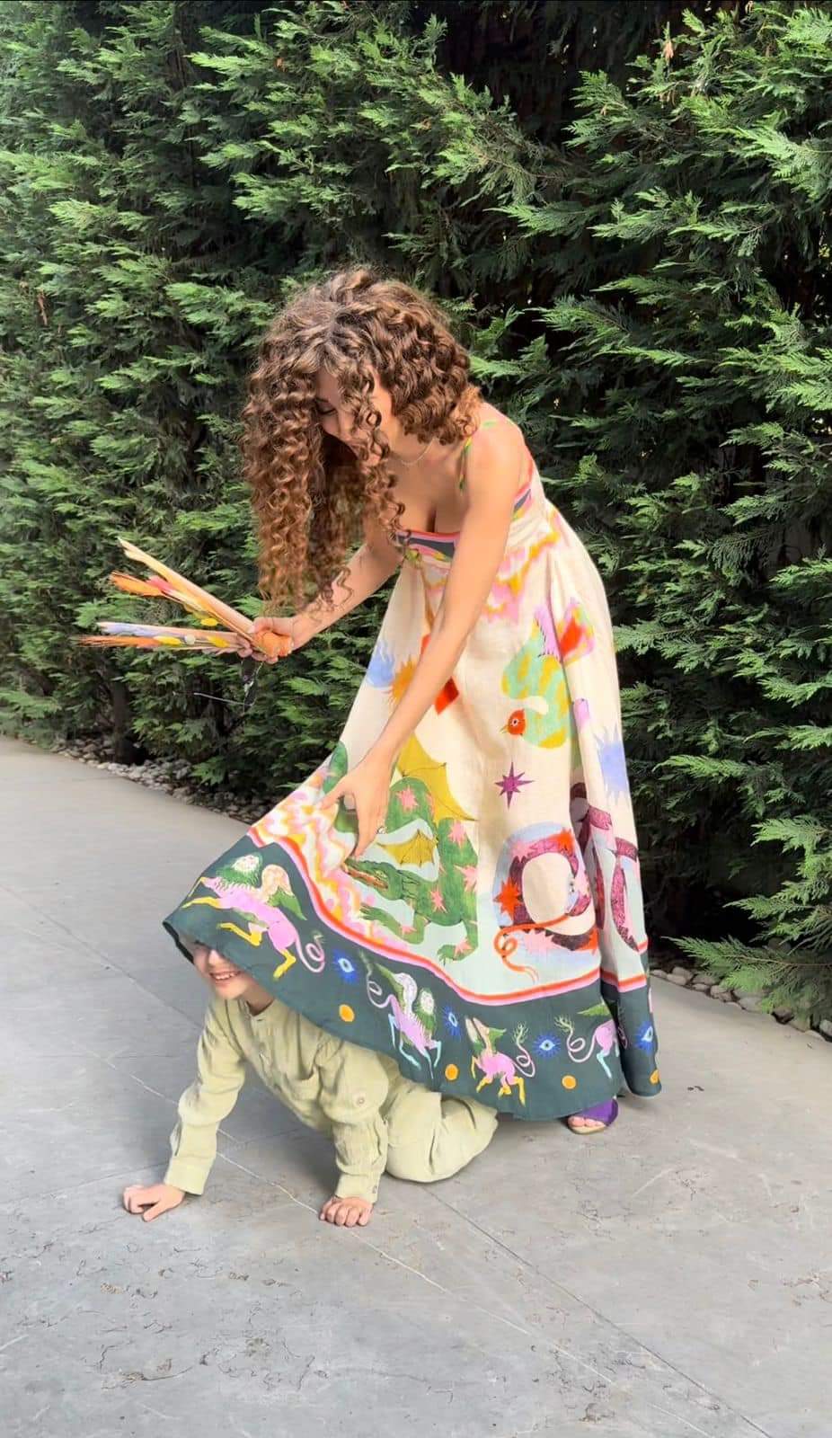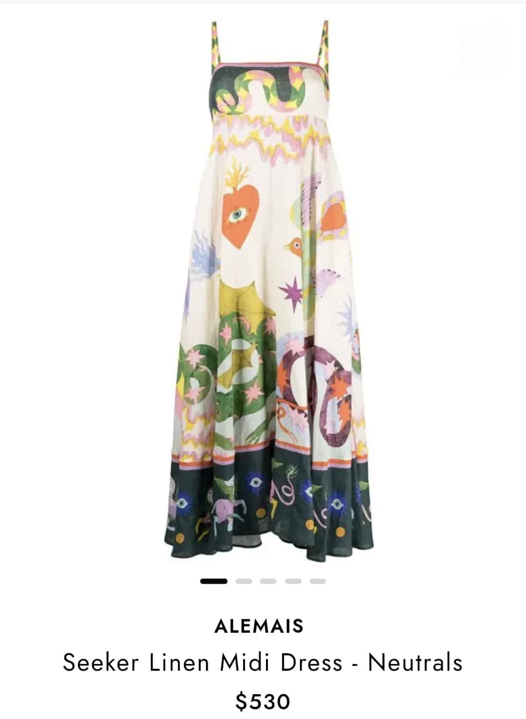 الفستان متوسط الطول من خامة الكتان، مطبوع عليه رسومات مختلفة على شكل طائر وثعبان وتنين، من ALEMAIS.