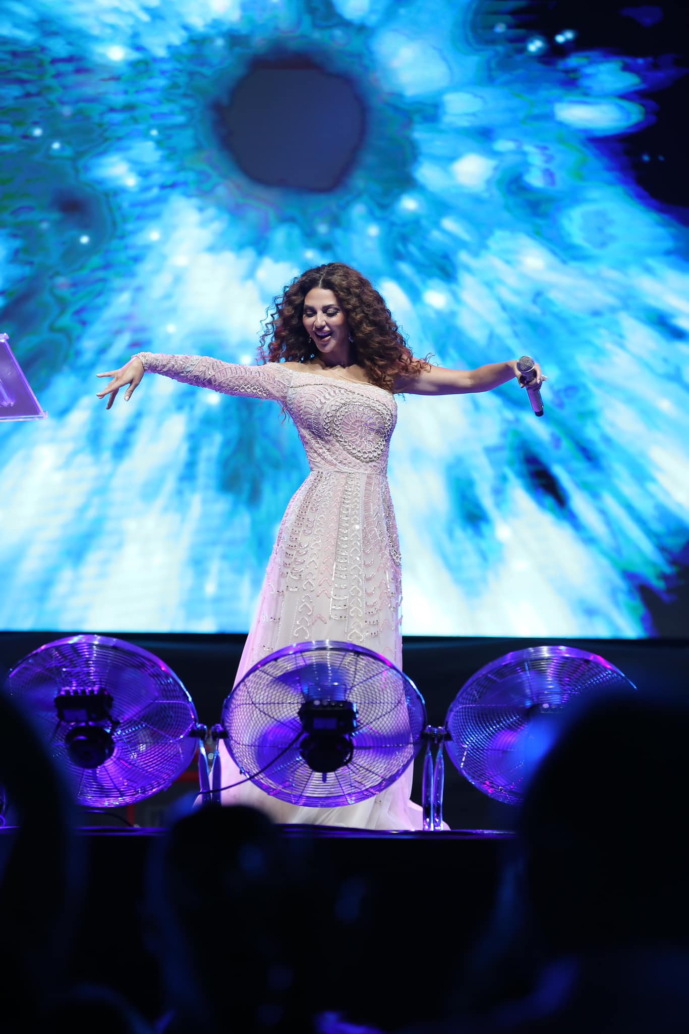 فستان بكم واحد طويل وكتف عار مخصر عند الوسط ومتهدل مع بعض الفضفضة الناعمة مما يساعد الفنانة المشهود لها في حركتها على المسرح وادائها الراقص.