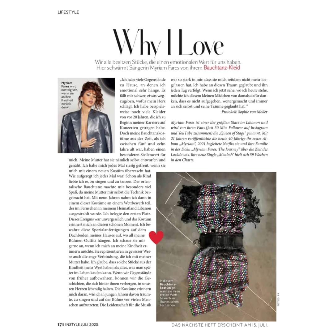 في بيان صادر عن مكتبها الإعلامي، وصفت الفنانة ميريام فارس نفسها بالعالمية، وأشارت إلى أن مجلة InStyle العالمية نشرت بنسختها الألمانية المطبوعة في عدد شهر يوليو، مقالاً حصريا عنها ضمن تحقيق تنشره المجلة في كل عدد بعنوان “Why I Love” “لماذا احب” تسأل من خلاله المشاهير العالميين عن شيء ثمين يمتلكونه وله مكانة خاصة في قلوبهم.