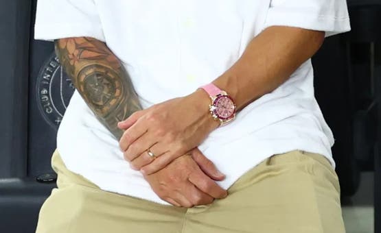 شوهد النجم الأرجنتيني ليونيل ميسي وهو يرتدي ساعة وردية اللون مستوحاة من دمية “باربي” الشهيرة بقيمة 700 ألف دولار أميركي خلال حضوره مباراة فريقه أمام سنسيناتي والتي حرم من المشاركة فيها بعقوبة انضباطية.