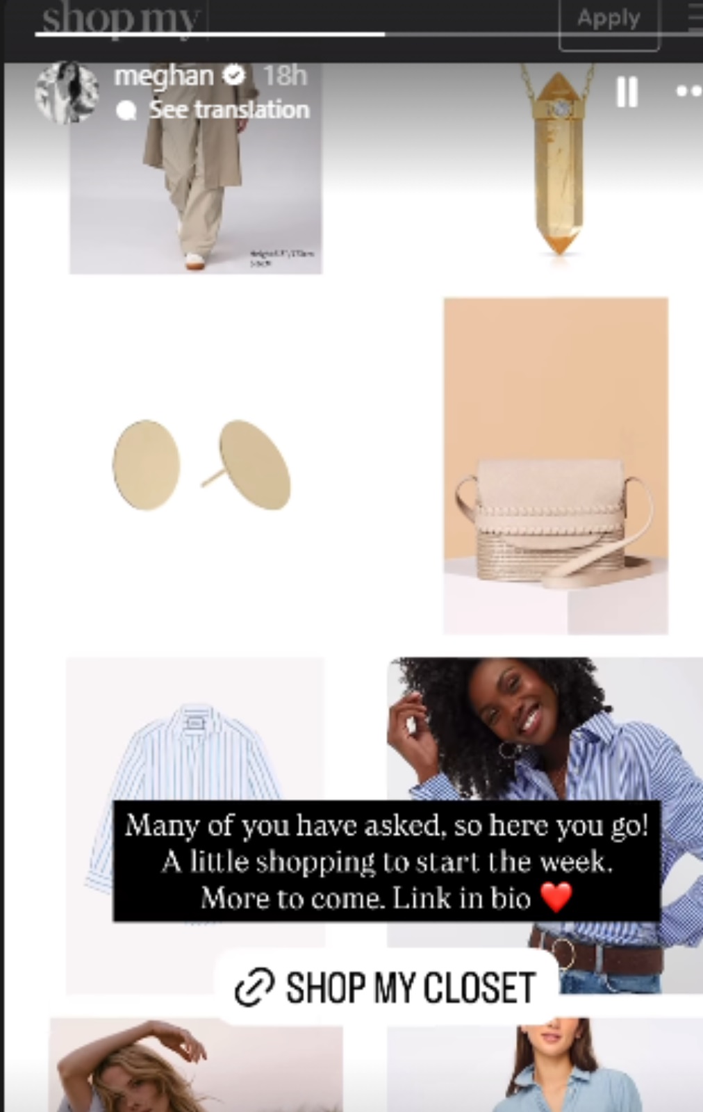 شاركت ميغان متابعيها عبر حسابها في “إنستغرام” رابط المتجر الرقمي “ShopMy”،وأضافت تنويهًا أنها ستتلقى عمولة مبيعات على بعض المنتجات التي يتم شراؤها من خلال الروابط التابعة التي شاركتها.