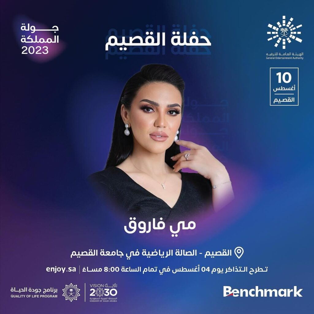 ونشرت شركة بنش مارك عبر صفحتها الرسمية بموقع تبادل الصور والفيديوهات انستجرام، تفاصيل حفل مي فاروق المقرر أن يقام في مدينة القصيم يوم 10 من شهر أغسطس الجاري، حيث كتبت: جمهور القصيم جاهزين نستمتع بالأجواء الطربية مع الفنانة مي فاروق، ضمن حفلات جولة المملكة 2023.