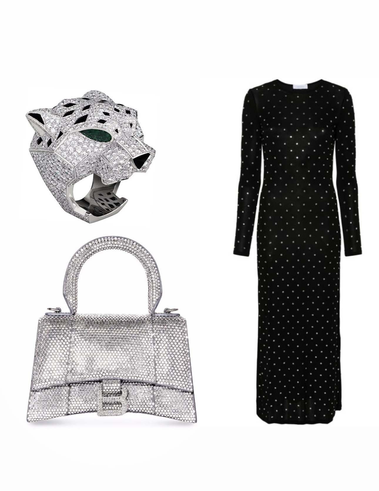 كما حملت نادين حقيبة يد فاخرة باللون الفضّي المزين بالكريستال، وهي من تصميم “بالنسياغا” Balenciaga، وتبلغ قيمتها 7,336 دولار. وزينت أذنيها بقرطين طويلين برّاقين، وارتدت خاتمين ضخمين، أحدهما خاتم Panthere من “كارتيه” Cartier، المرصع بالألماس والزمرّد والأونكس الأسود، بقيمة 180,000 دولار.