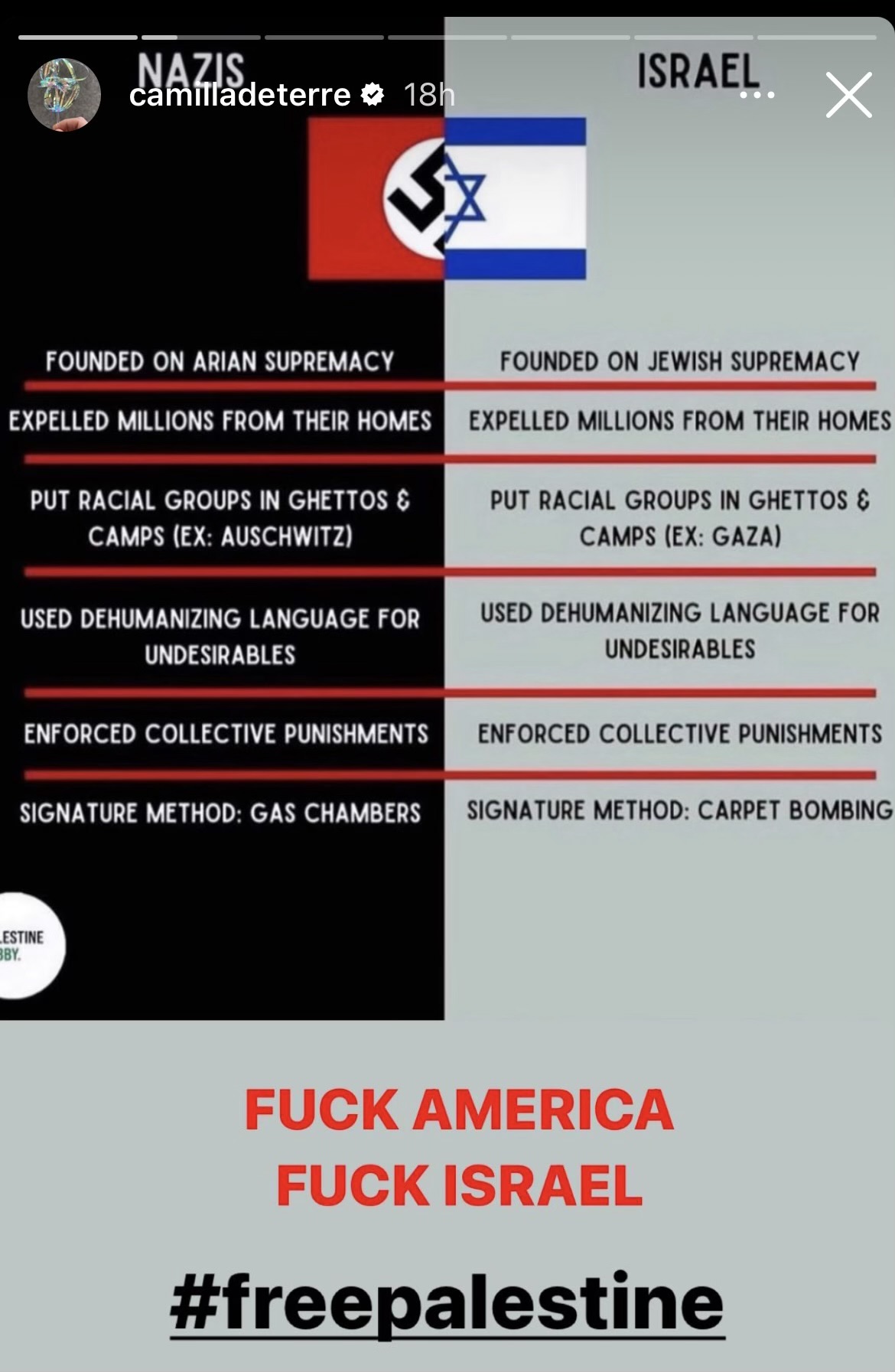 فقد قامت المجموعة بعرض منشورات ديتير على “إنستغرام”، والتي تضمنت مقارنة بين الكيان الإسرائيلي وألمانيا النازية وكذلك شتائم للكيان وأميركا مع وسم “فلسطين حرة”.