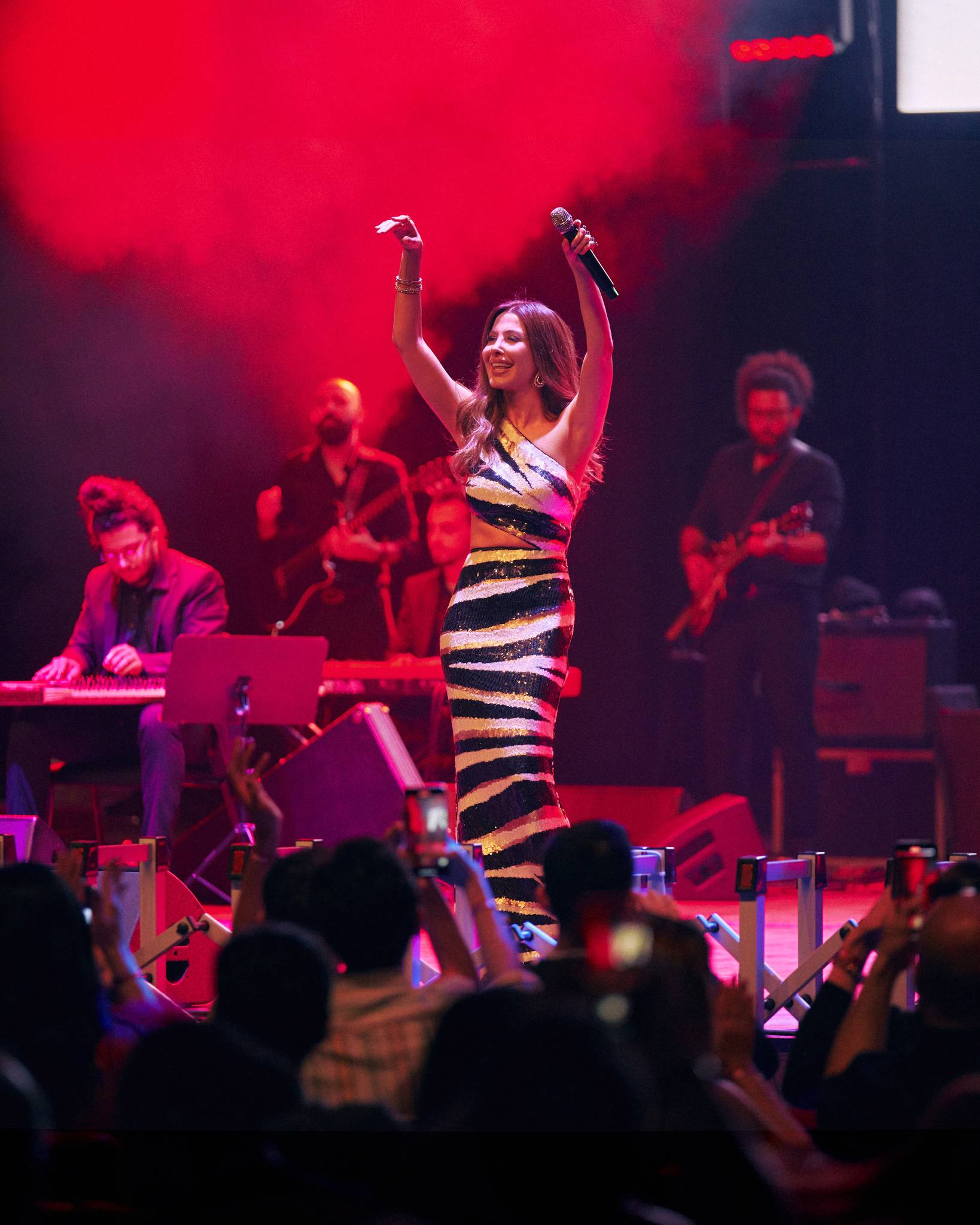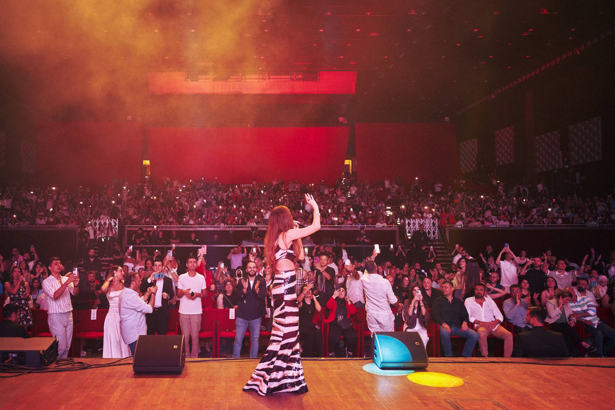 تمسح خطواتها فوق مسرح حضنه الألوف غناء ورقصاً. وهي تترك شعرها المنسدل الناعم يغازل أجواء النغم والفرح والرقص. تسريحة من رنزي زغيب ومكياج من ريتا برقاشي طبيعي السحنة فرحة المحيا نقية النظر بأحمر الشفاه العسلي.