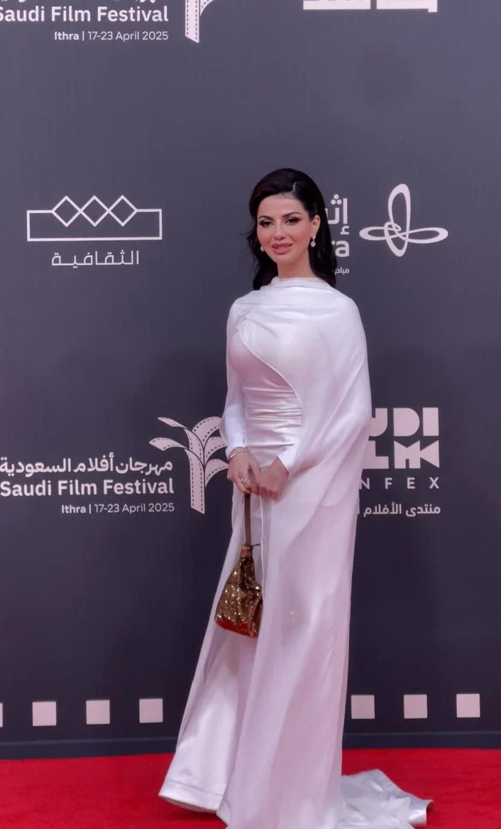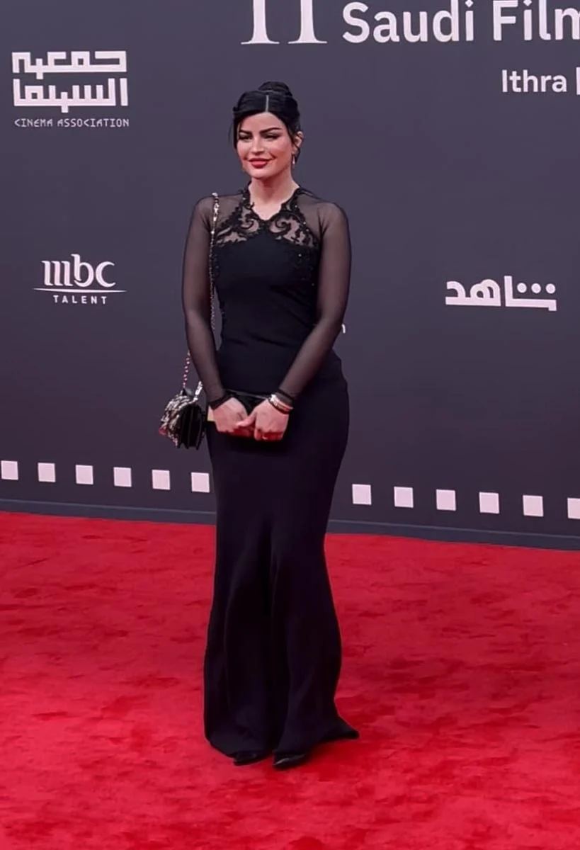 اختارت ميلا الزهراني فستاناً أسود أنيقاً، يتميز بأكمام شفّافة وتطريزات برّاقة عند الصدر، بتصميم كلاسيكي ناعم، أضافت إليه بريقاً خاصاً من خلال مجوهرات ذهبية مرصّعة بالألماس.