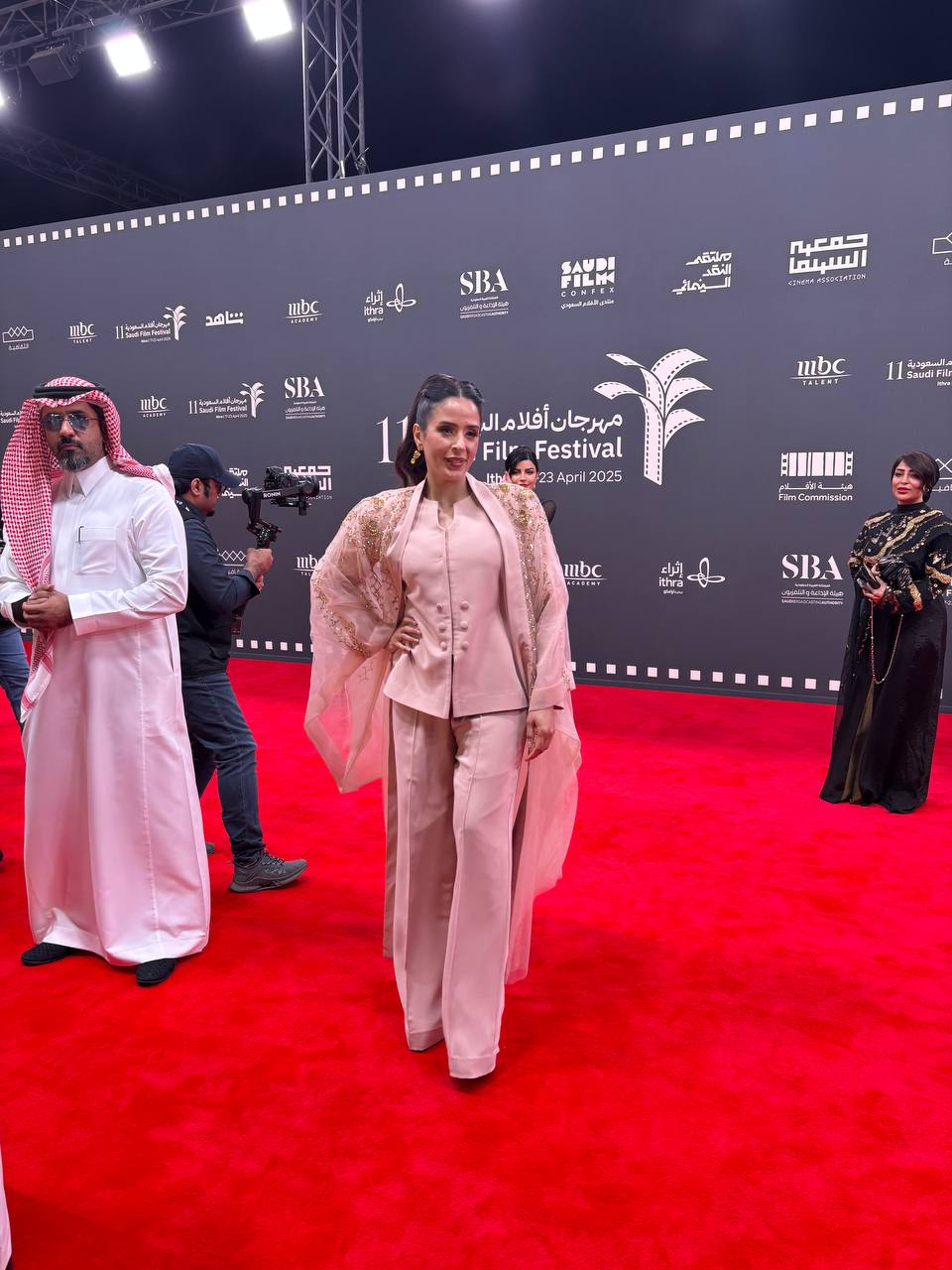تميّزت جود السفياني بإطلالة ناعمة بلون باستيلي، بتصميم عصري مزوّد بطبقة إضافية وياقة مفتوحة، نسّقتها مع أقراط ألماس متدلّية وحقيبة “كلاتش” فاخرة.