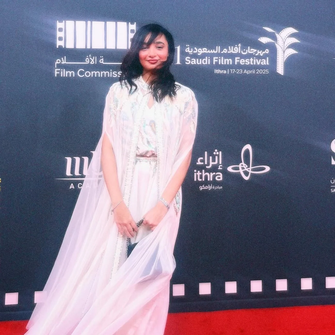 ارتدت رنا مطر ثوباً شرقياً أبيض اللون من تصميم دار Shalky، مكوّناً من فستان داخلي بسيط بتطريزات هادئة، وقطعة خارجية شفّافة أشبه بالعباءة ذات الأكمام المفتوحة.