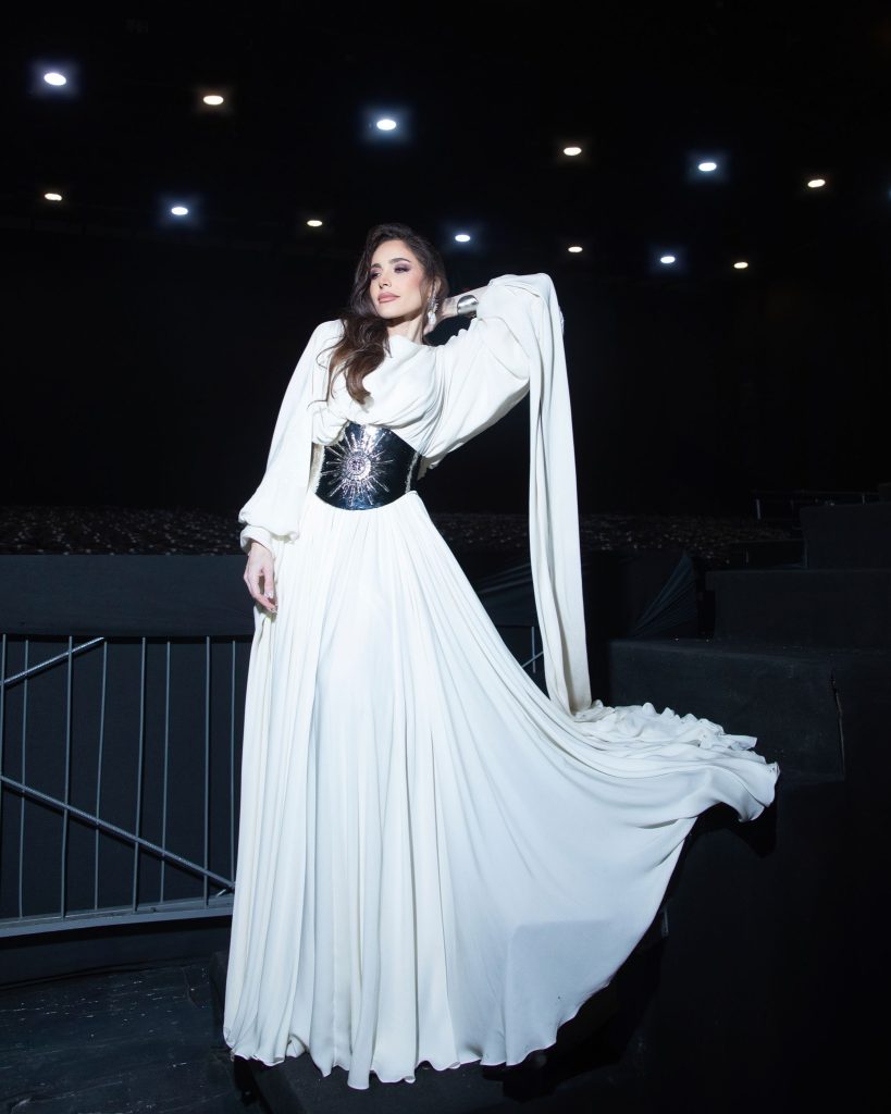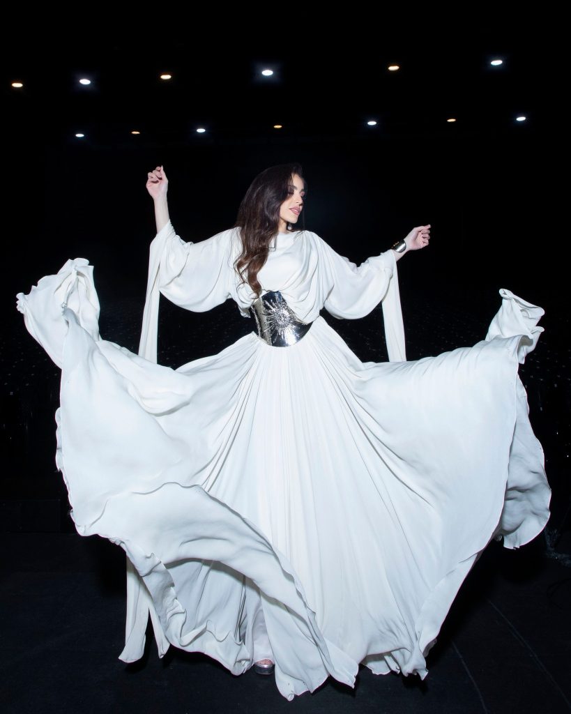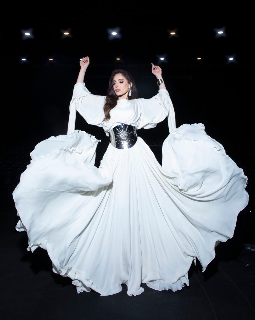 نجوى كرم خلال حفلها في الامارات العربية المتحدة ارتدت ثوباً ابيض من نيكولا جبران ثوب أبعد من لونه انه ساحات ورايات سلام منصوبة في قاعات الحب والفن. شاءتها نجوى كرم بداية لعام جديد من ظلال الإيجابية والنقاء والهدوء. ثوب بأكتاف مائلة تعمر الاكمام وأوشحة تتناثر على خطى الوهج النقي.