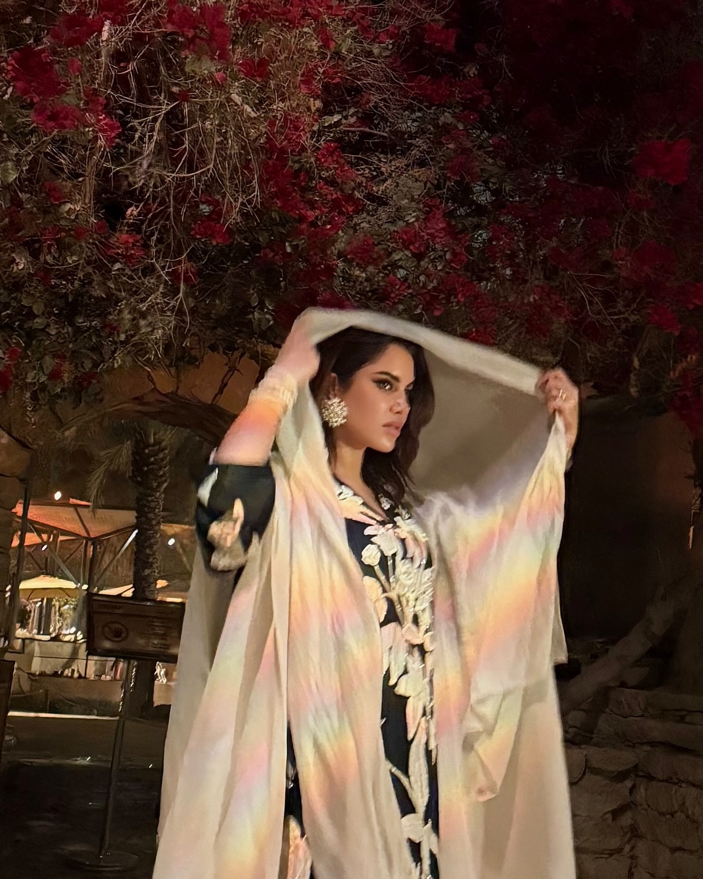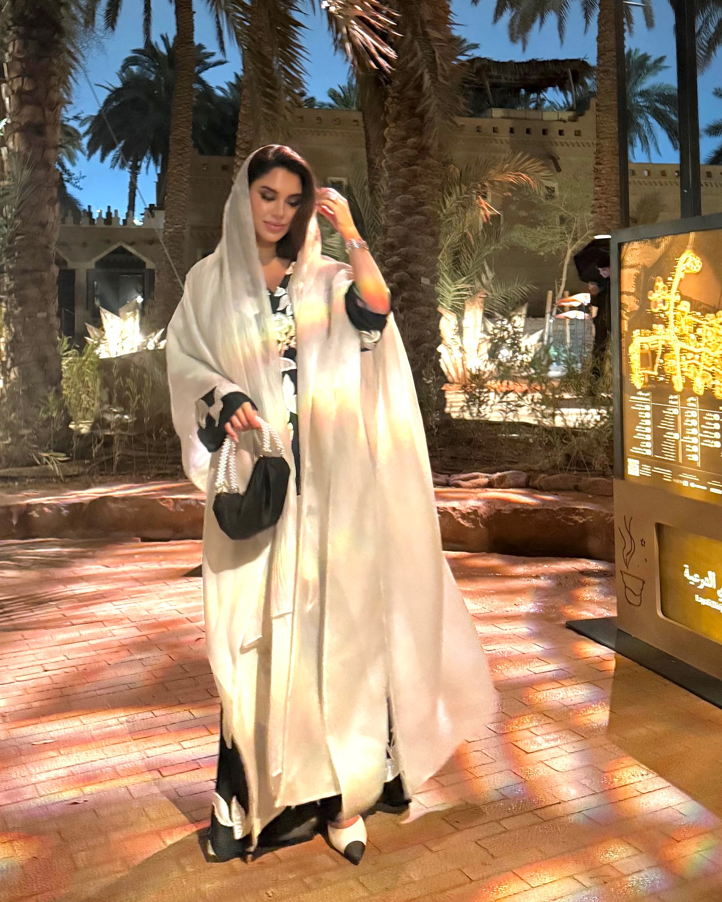 بمناسبة “ليالي الدرعيّة”، اختارت نجود درّاعة باللون الأسود الراقي ورمز القوّة، مطبّعة بأزهار بيضاء تشير إلى الأنوثة والرقة، ما يخلق توازناً بين الجرأة والنعومة في الإطلالة. كذلك، نسّقت نجود درّاعتها مع رداء أبيض طويل وحجابٍ من اللون نفسه. هذا الاختيار ، يدلّ على شخصية تجمع بين الثقة بالنفس والجانب الرومانسي الحالم، كما أنها مثاليّة لإطلالة مريحة وأنيقة في الوقت نفسه.