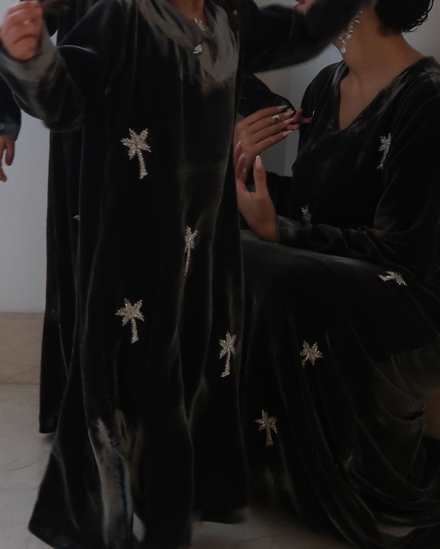 في إطلالة مختلفة من علامة “ستولا” (Stola)، اختارت نجود قفطاناً من المخمل الأسود المطرّز بالخرز الفضّي البرّاق على شكل شجر النخيل، رمز المملكة العربيّة السعوديّة، والفخامة، والهويّة الخليجيّة. في حين أن اللون الأسود هو رمز القوّة والأناقة التي لا تتأثر بالزمن. وأشجار النخيل ترمز إلى العطاء والجذور العميقة في الثقافة العربية. اختيارها لهذا التصميم يجمع بين الفخامة التقليدية واللمسات العصرية، ما يعكس ذوق نجود الراقي وقدرتها على المزج بين التراث والموضة الحديثة.