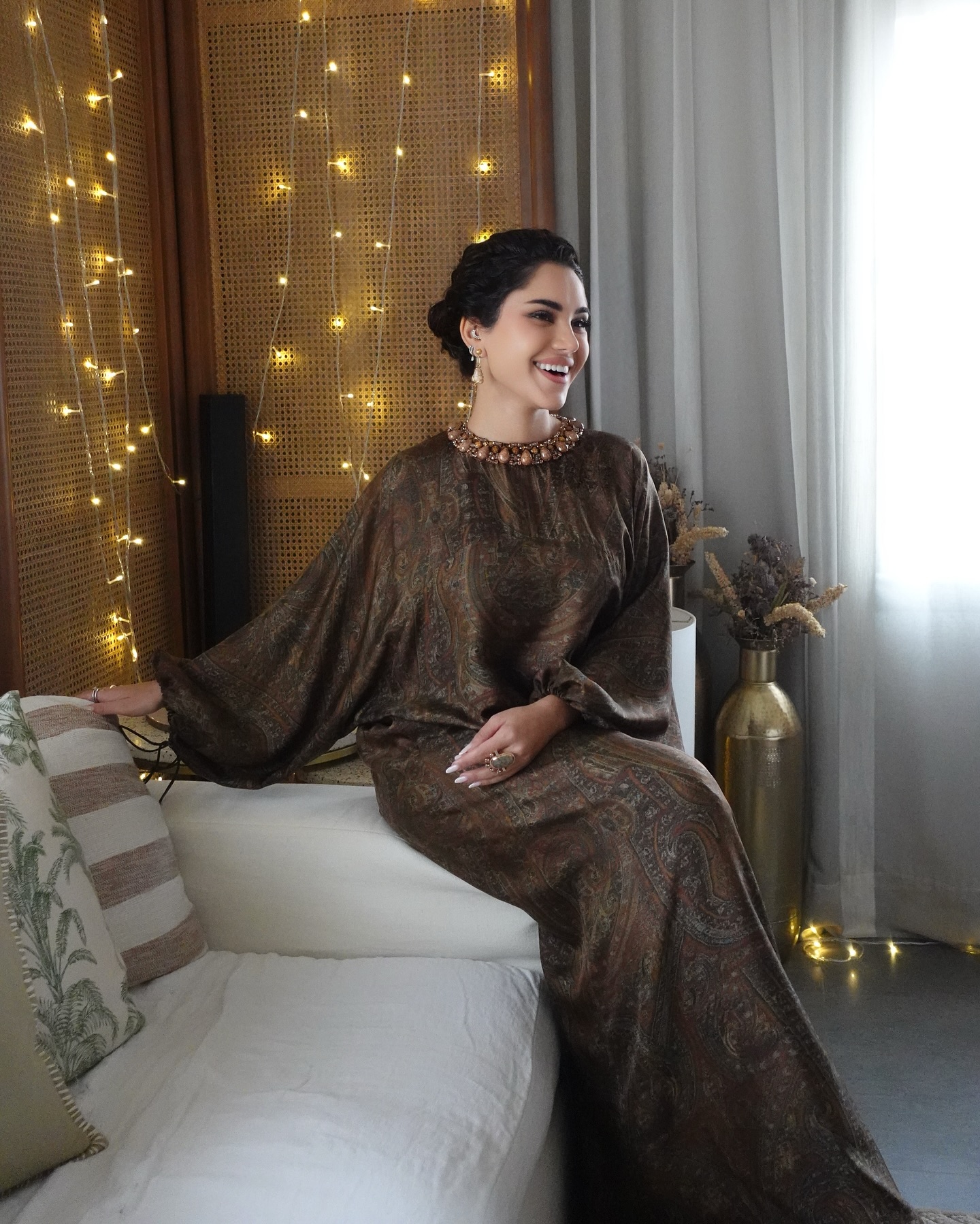 ينتمي البنّي إلى الألوان الترابيّة الدافئة. وارتداء هذا اللون في العباءات يضفي لمسة من الفخامة ويعكس شخصية هادئة ومتزنة. كما أنه لون يعبّر عن القوة الداخلية والثقة بالنفس دون الحاجة إلى المبالغة في التفاصيل. وقد اختارت نجود عباءتها الأنيقة باللون البنّي المطبّع بالرسوم الناعمة والمطرّزة بأحجار برونزيّة حول الياقة، أيضاً من مجموعة “ماكس مارا” (Max Mara) المخصّصة لشهر رمضان.