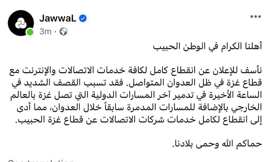 وقالت شركة الاتصالات الفلسطينية- جوال فى بيان: نأسف للإعلان عن انقطاع كامل وكافة خدمات الاتصالات والانترنت مع قطاع غزة في ظل العدوان المتواصل. فقد تسبب القصف الشديد في الساعة الاخيرة بتدمير جميع المسارات الدولية المتبقية التي تصل غزة بالعالم الخارجي بالإضافة للمسارات المدمرة سابقاً خلال العدوان، مما أدى إلى انقطاع لكامل خدمات شركات الاتصالات عن قطاع غزة الحبيب.