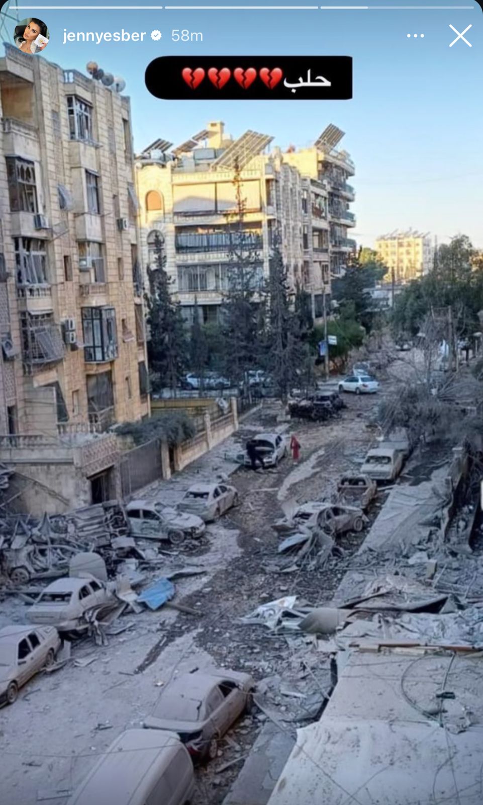 الممثلة جيني إسبر شاركت صورة تُظهر الدمار في حلب عبر خاصية القصص المصورة، وأرفقتها برموز قلوب مكسورة، معبرة عن حزنها العميق.