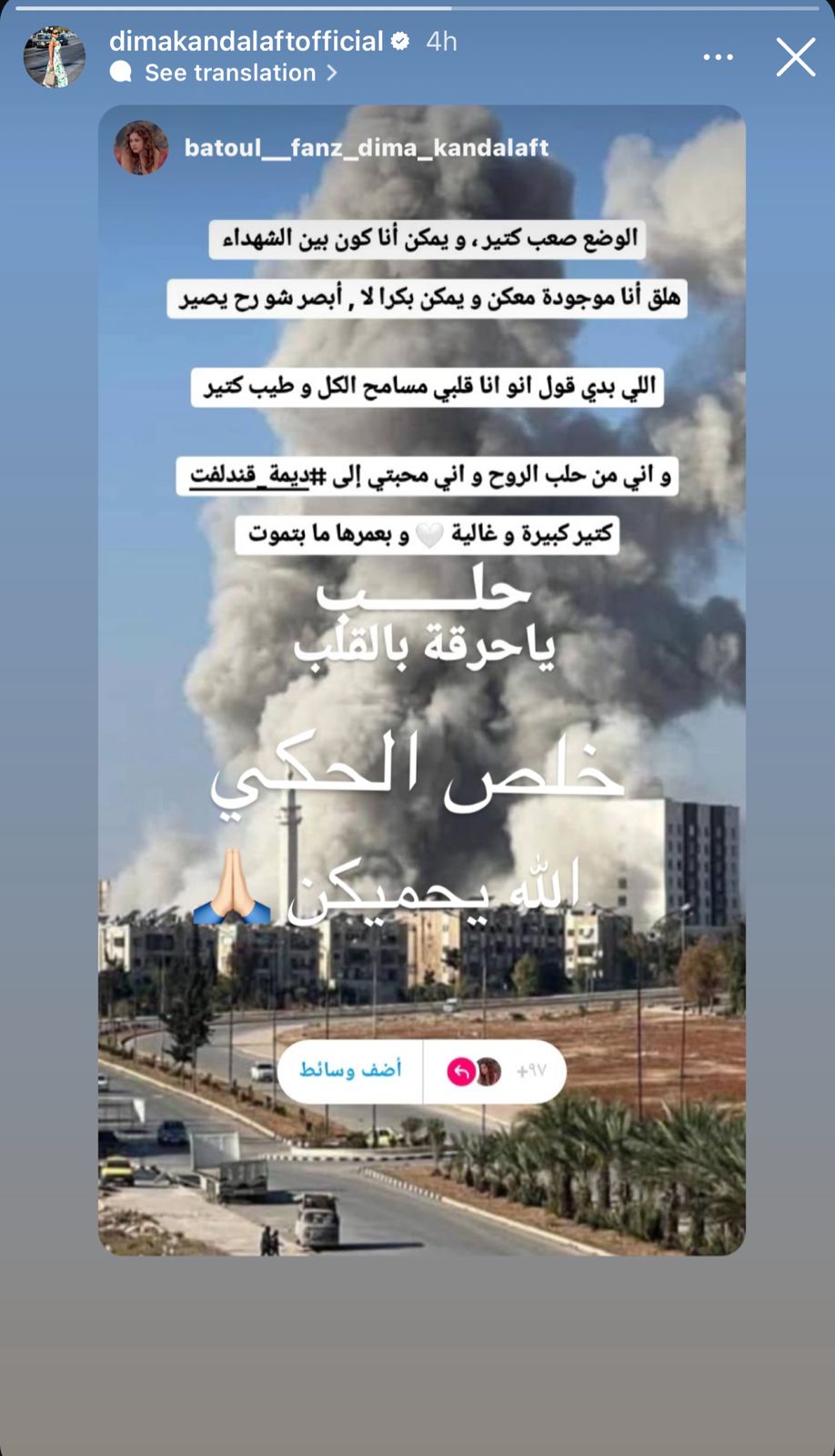 بينما أعادت الممثلة ديما قندلفت مشاركة منشور لفتاة تدير حساباً لمعجبيها، حيث كتبت: “الوضع صعب جداً، ومن الممكن أن أكون بين الشهداء، الآن أنا موجودة معكم، ويمكن بكرا لا، لا أدري ماذا سيحدث”. وأعربت قندلفت عن تأييدها لمشاعر المعجبة، قائلة: “انتهى الكلام، الله يحميكم”.