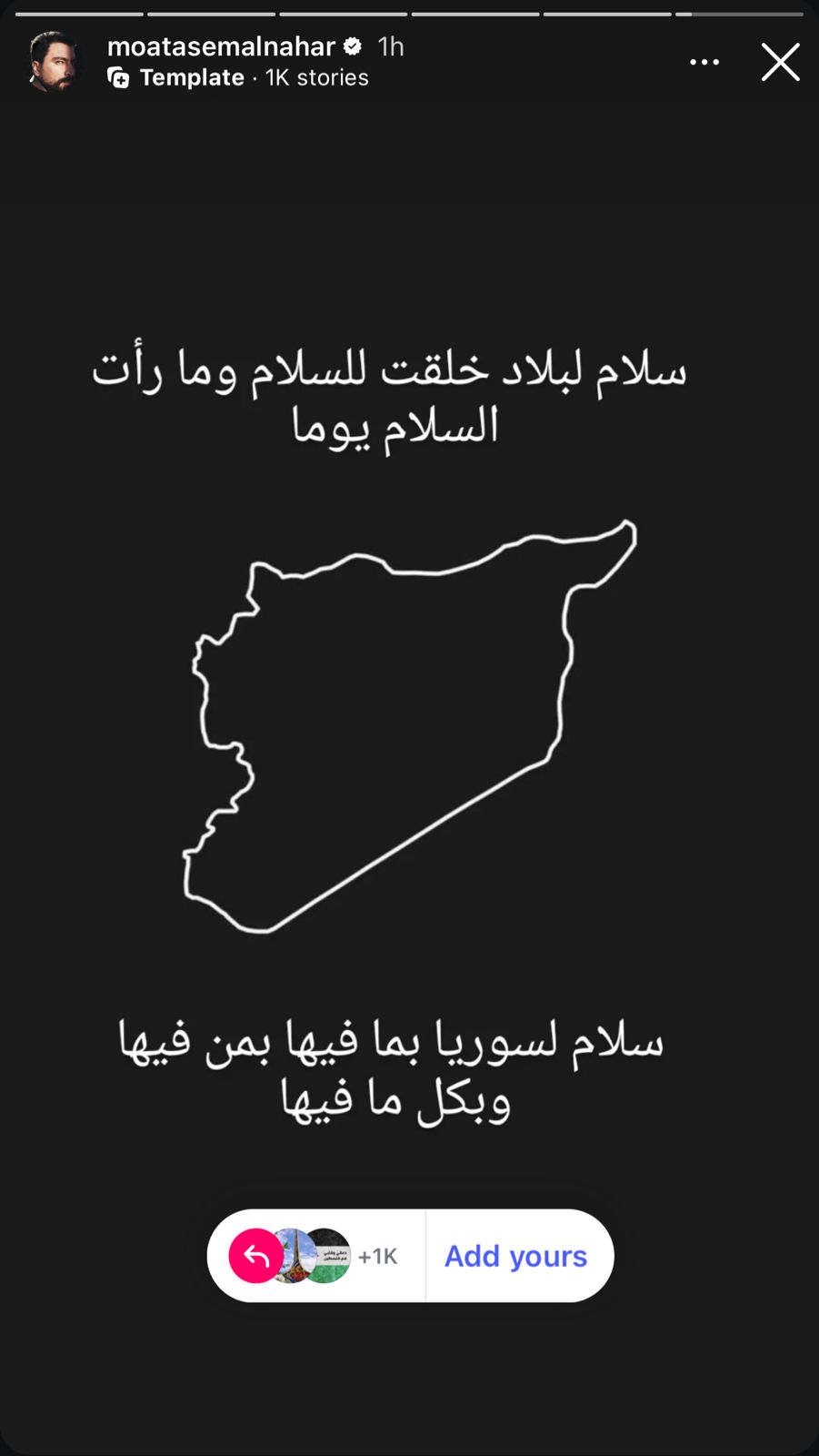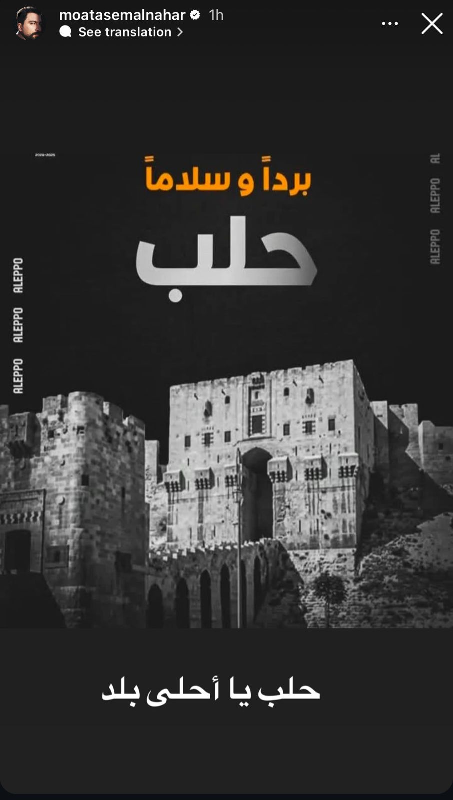 ونشر الممثل معتصم النهار صورة تعبيرية كُتب عليها: “برداً وسلاماً حلب”، مرفقاً إياها بتعليق: “حلب يا أحلى بلد”. كما أضاف صورة أخرى تحتوي على خريطة سوريا، مع رسالة سلام للبلد الذي “خلقت للسلام وما رأت السلام يوماً”.
